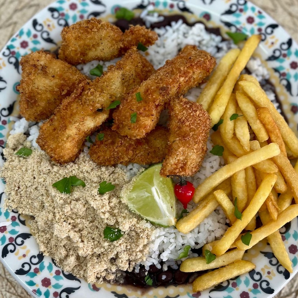Peixe empanado dourado, com textura sequinha e bem temperado. Acompanha arroz branco, feijão do dia, farofa e batata frita ou ovo frito.