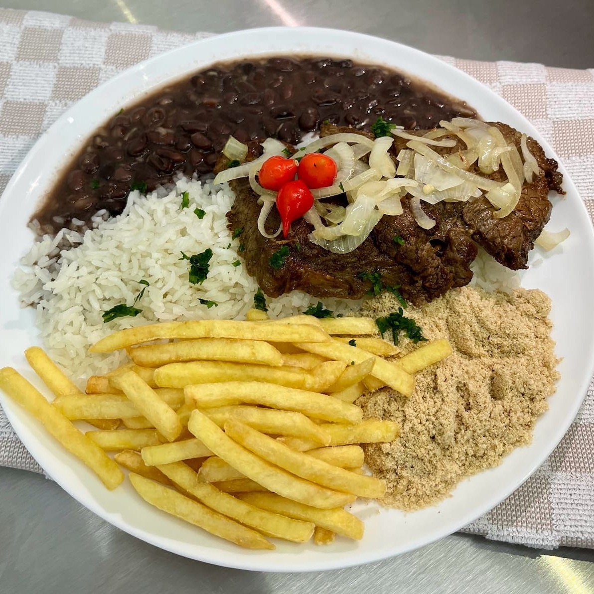 Carne macia feita na hora com cebola salteada, trazendo aquele sabor caseiro. Servida com arroz, feijão, farofa e fritas ou ovo.