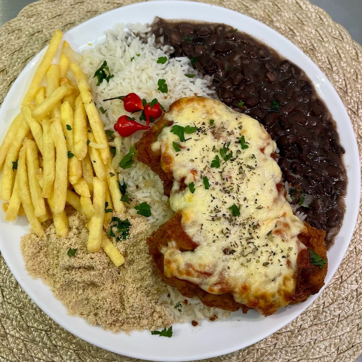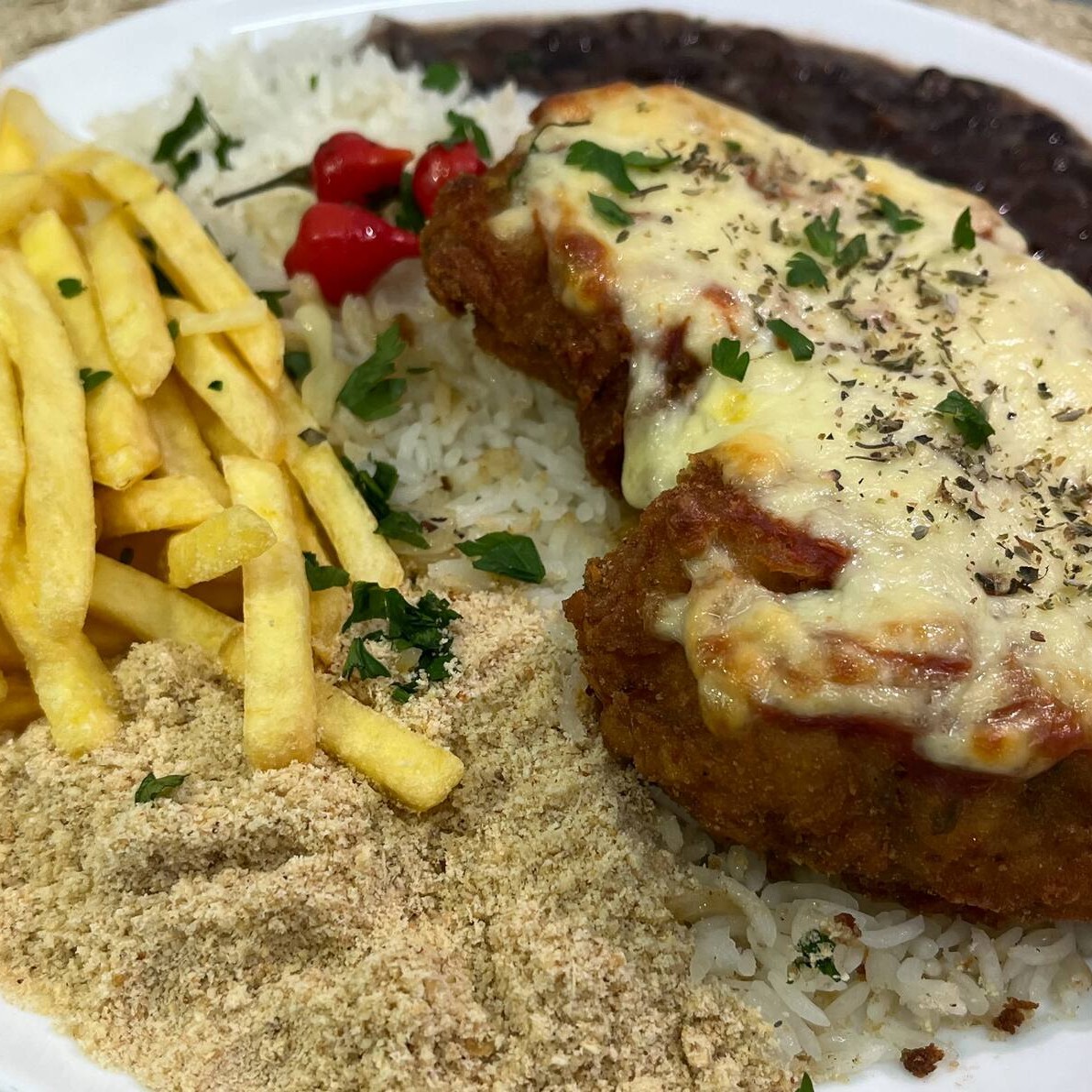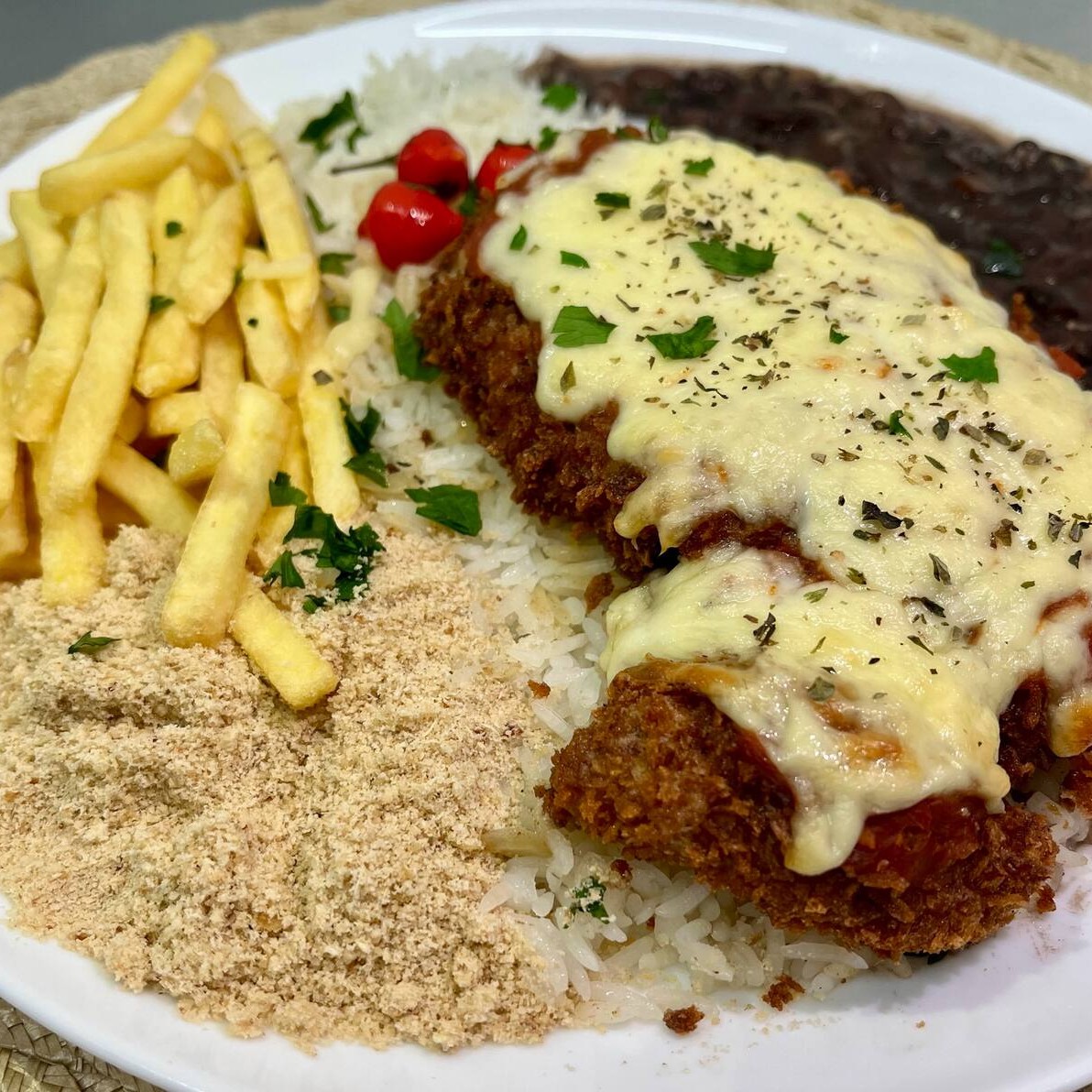 Frango empanado preparado na hora, coberto com molho caseiro e queijo derretido. Acompanha arroz branco, feijão do dia, farofa e batata frita ou ovo.