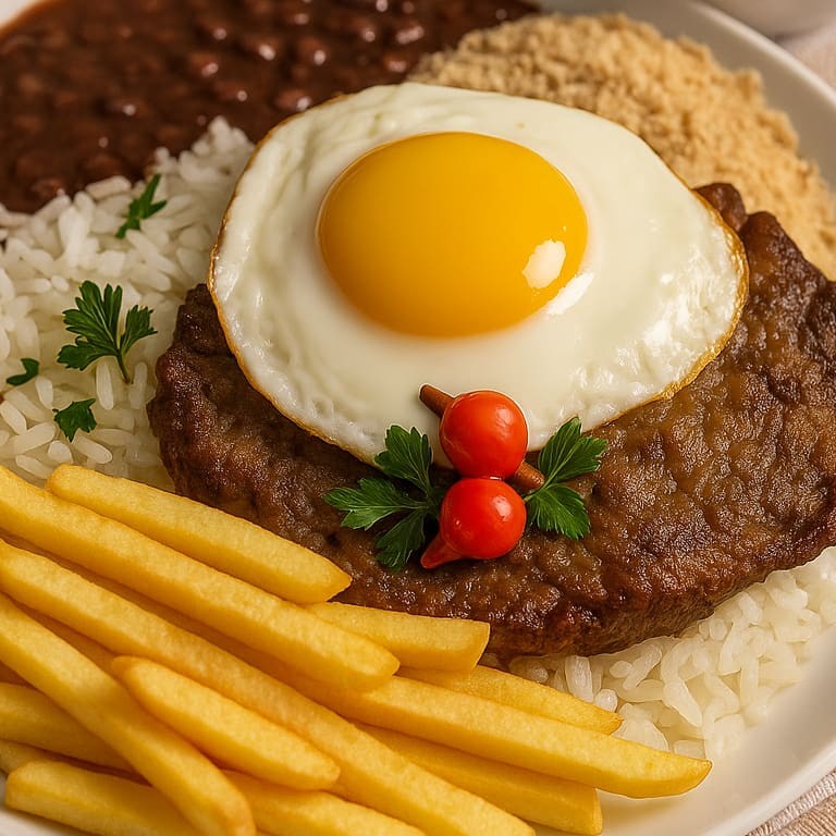 Bife feito na hora com ovo frito, trazendo aquele sabor clássico de comida caseira. Vai com arroz, feijão, farofa e opção de fritas ou mais um ovo.