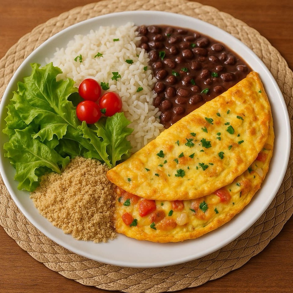 Omelete macio e dourado, com queijo derretido, cebola e tomate. Vai com arroz, feijão, farofa crocante e salada fresca.