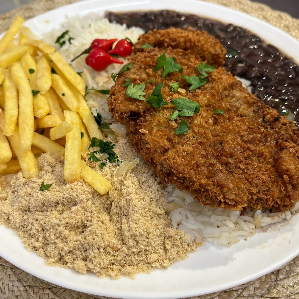 Carne empanada dourada, com casquinha crocante e interior macio, bem temperada. Acompanha arroz branco, feijão do dia, farofa e opção de batata frita ou ovo.