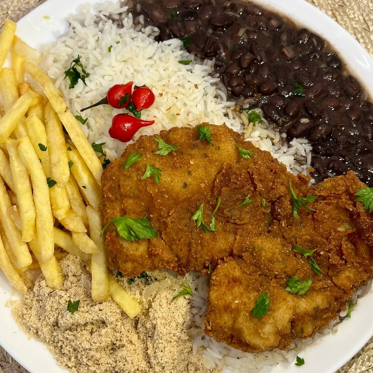 Frango empanado dourado, com casquinha sequinha e sabor de comida feita em casa. Acompanha arroz branco, feijão do dia, farofa e batata frita ou ovo frito.