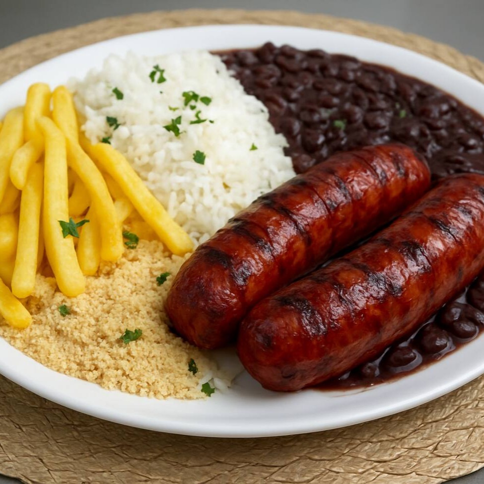 Linguiça toscana dourada, bem temperada e suculenta. Acompanha arroz branco, feijão do dia, farofa e opção de batata frita ou ovo.