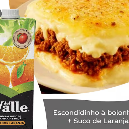 Delicioso escondidinho à bolonhesa, acompanhado de arroz, feijão e batata frita + suco de laranja 1lt geladinho
