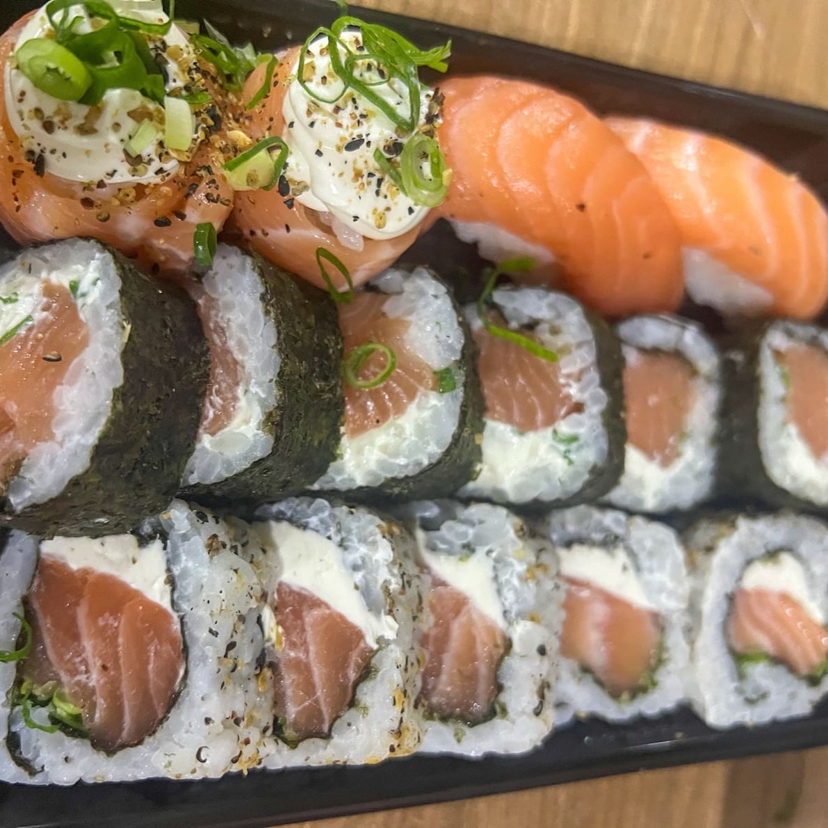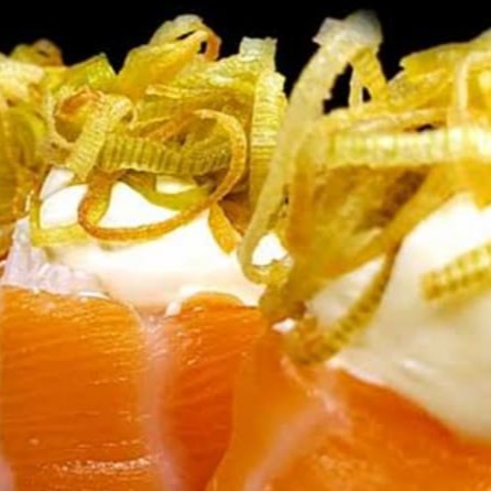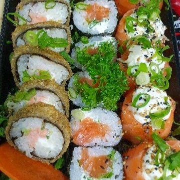Arroz japonês , Salmão, sunomono, alho poró, cream cheese