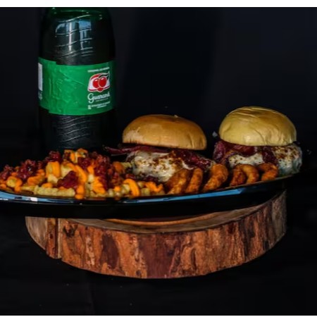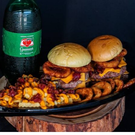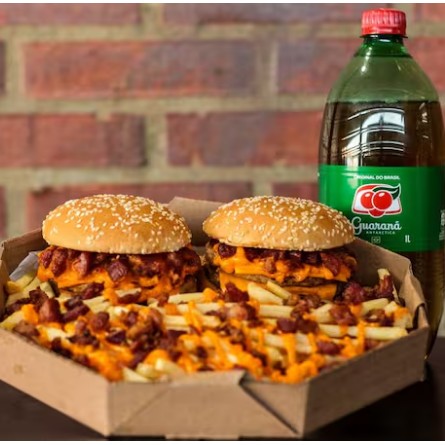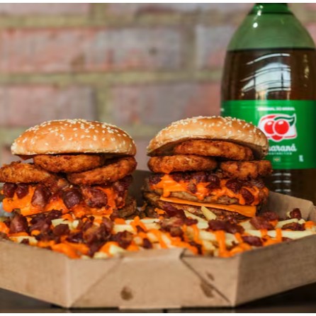 2 Lanches Com 3 Carnes, Queijos, Bastante Cheddar, Anéis De Cebola E Bacon. Acompanha Batata Turbinada E Um Refri De 1 Litro.