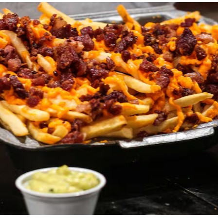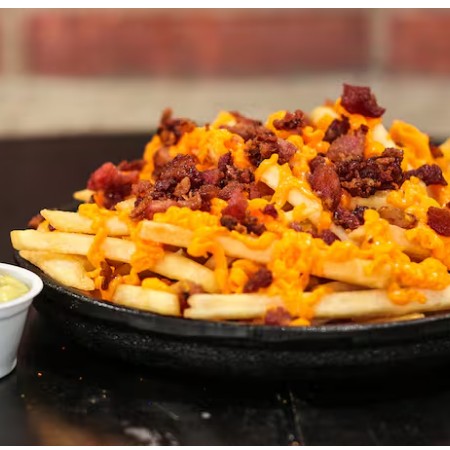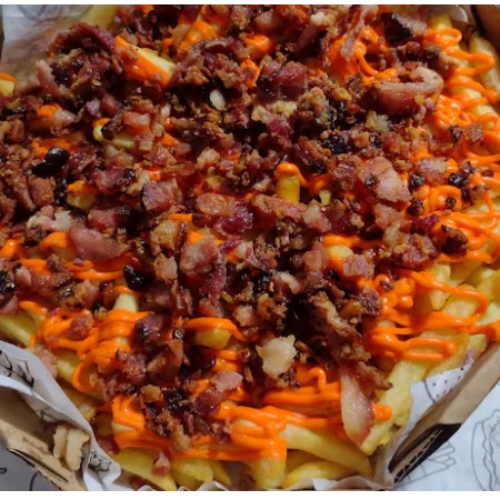 400g de batata frita, queijo cheddar e suculentos pedaços de bacon. Total de aproximadamente 450g