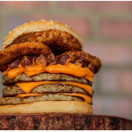 Pão, 3 carnes, 3 fatias de queijo cheddar, tiras de bacon fatiado, cheddar cremoso e crocantes anéis de cebolas. Mais batata combo e um refri 350ml