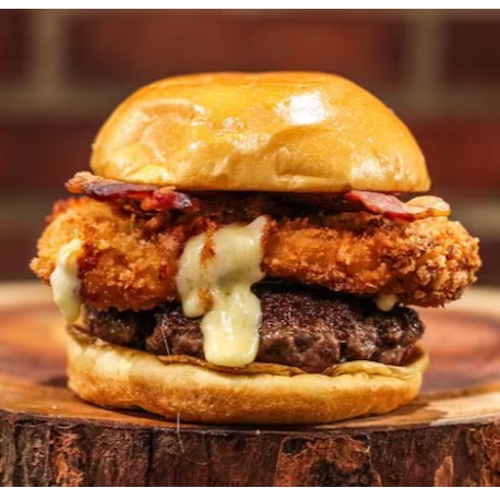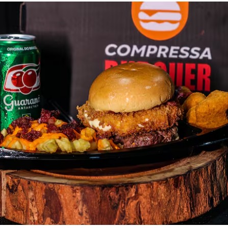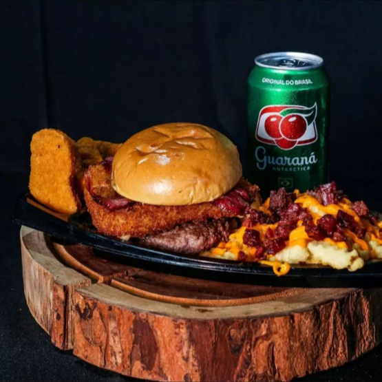 Acompanha Pão de brioche, 1 carne de 150g, 50 gramas de queijo mussarela empanada, bacon e maionese. Batata turbinada e refri de 350ml