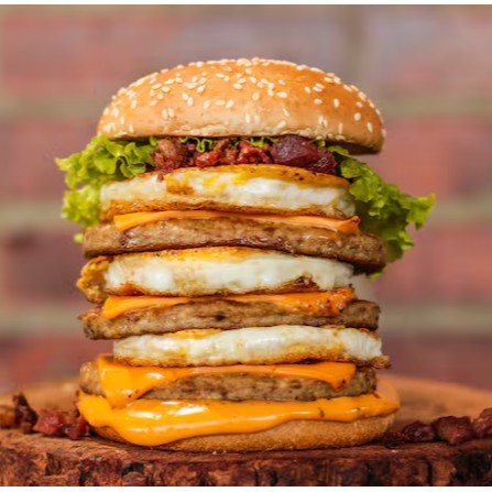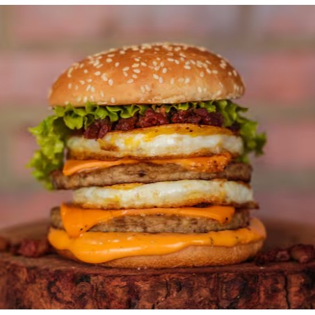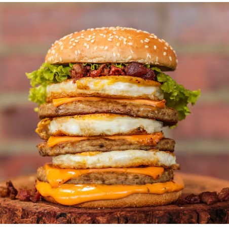 Pão, 3 carnes, 3 ovos, bacon, queijo cheddar, salada e molho da casa