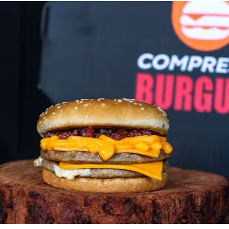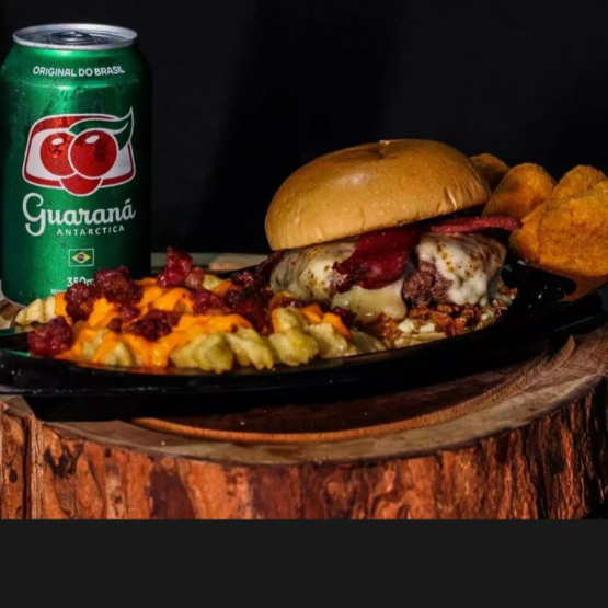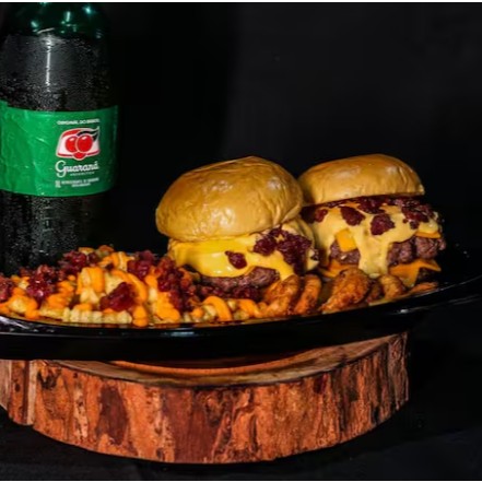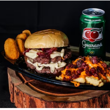 Acompanha Pão de brioche, 2 carnes de 150, 4 fatias de queijo cheddar, bacon e cheddar cremoso. Batata turbinada e refri.