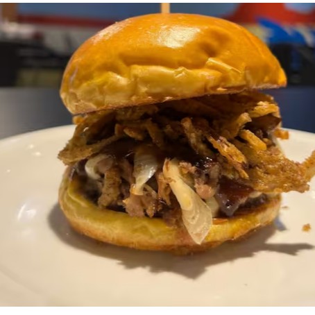 Pão de brioche, carne de 150 gramas, costela salteada na manteiga, mussarela, barbecue, cebola crispy.