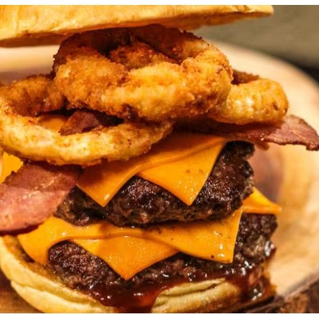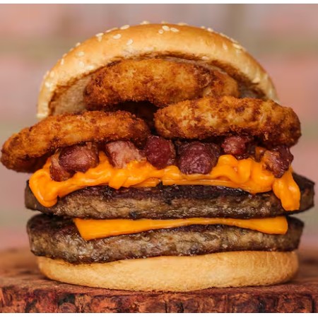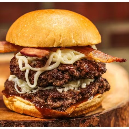 Pão De Brioche, 2 Carnes De 150 Gramas, 4 Fatias De Queijo Cheddar, Bacon Fatiado, Anel De Cebola E Barbecue