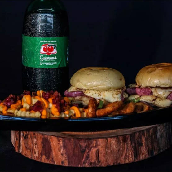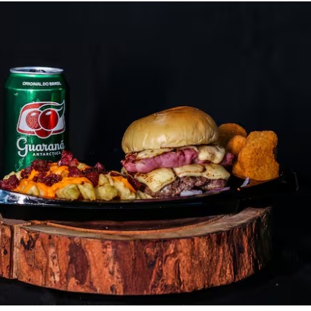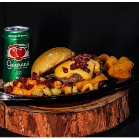Acompanha Pão de brioche, 150 gramas de carne, 100 gramas de linguiça suina, queijo coalho, alface americano, cebola roxa. Batata turbinada, refri de 350 ml.