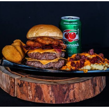 Acompanha Pão de brioche, 2 carnes de 150 gramas, 4 fatias de queijo, barbecue 3 aneis de cebola. Batata turbinada e refri de 350 ml