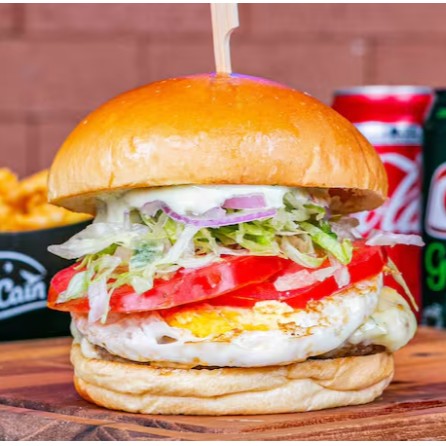 Pão De Brioche, 150 Gramas De Carne, 2 Fatias De Queijo Cheddar, Cebola Roxa, Alface Americano E Maionese Da Casa.