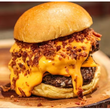 Pão De Brioche, 2 Carnes De 150 Gramas, 4 Fatias De Queijo Cheddar, Creme De Cheddar E Farofa De Bacon