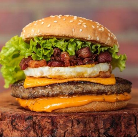 Pão, 2 carnes, 2 ovos, queijo cheddar, bacon, salada e molho da casa.