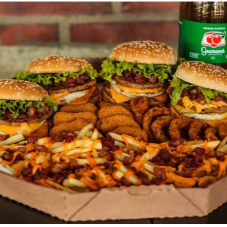 4 Lanches Com Carne Dupla, Batata Turbinada, 8 Unidades De Nuggets, 8 Aneis De Cebola E Um Refri De 1litro.
