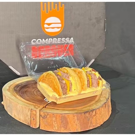 Pão de brioche, carne de 150 gramas, 100 gramas de costela com cream cheeser empanado e geleia de pimenta.