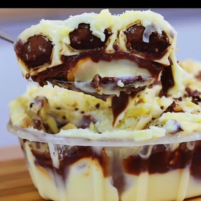Um delicioso brigadeiro branco e preto pedaços de brownier e Nutella