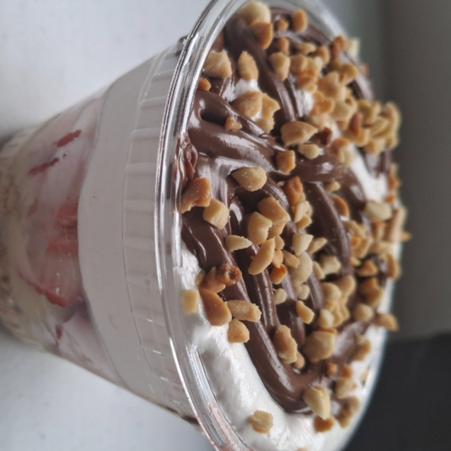 Um delicioso copo da felicidade, com Nutella, mousse de nutella e amendoim