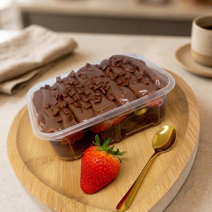 Brownie molhadinho morangos e chocolate 50%cacau finalizado com granule de chocolate nobre 250ml