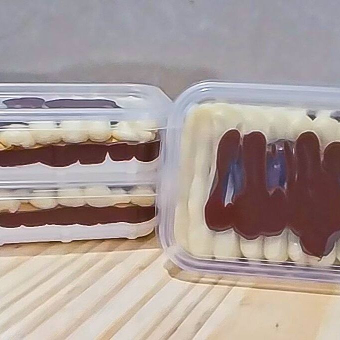 Pote de 145 ml recheado com nosso creme de chocolate e creme de leite ninho intercalados com biscoito maisena