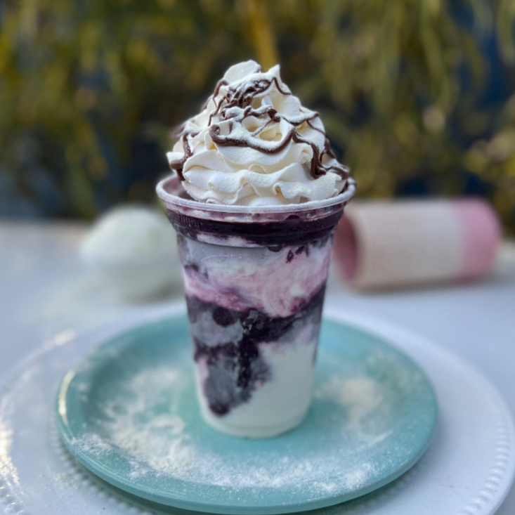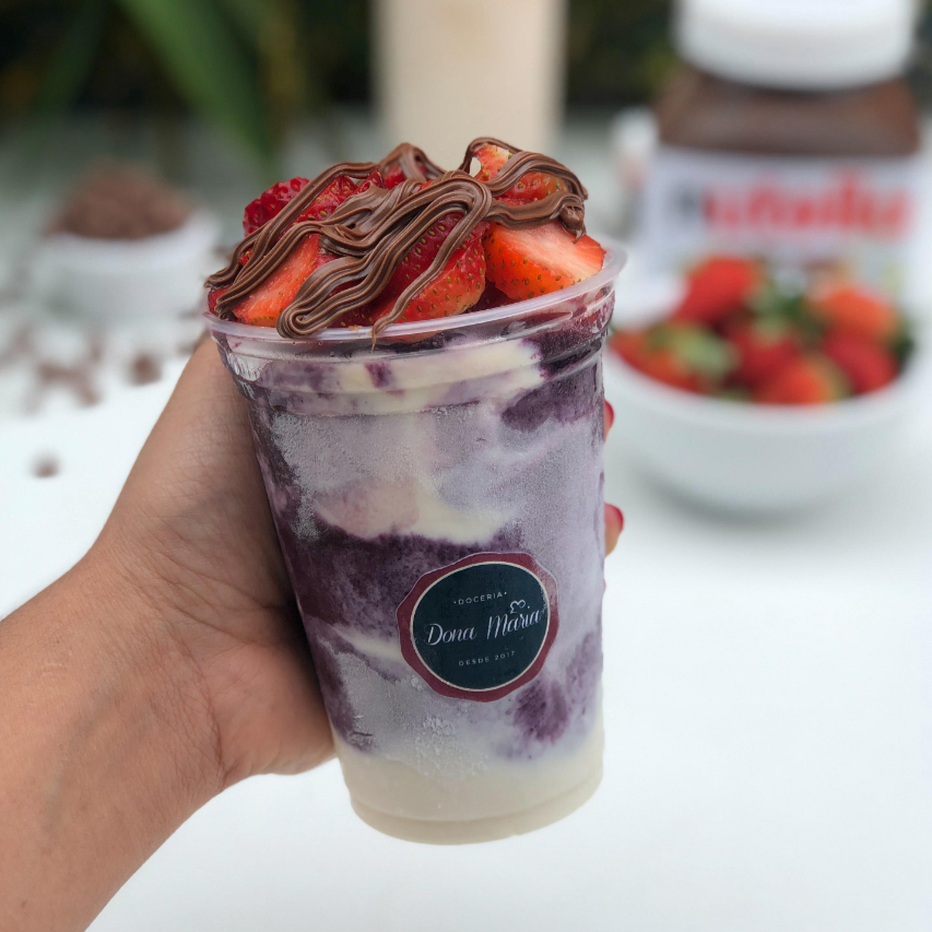 Camadas de mousse de Ninho que parece um sorvetiiiinho cremoso, camada de açaí, finalizada com chantininho e Nutella.