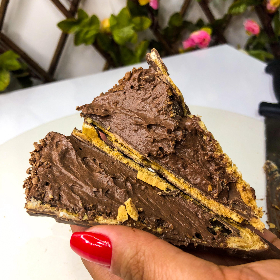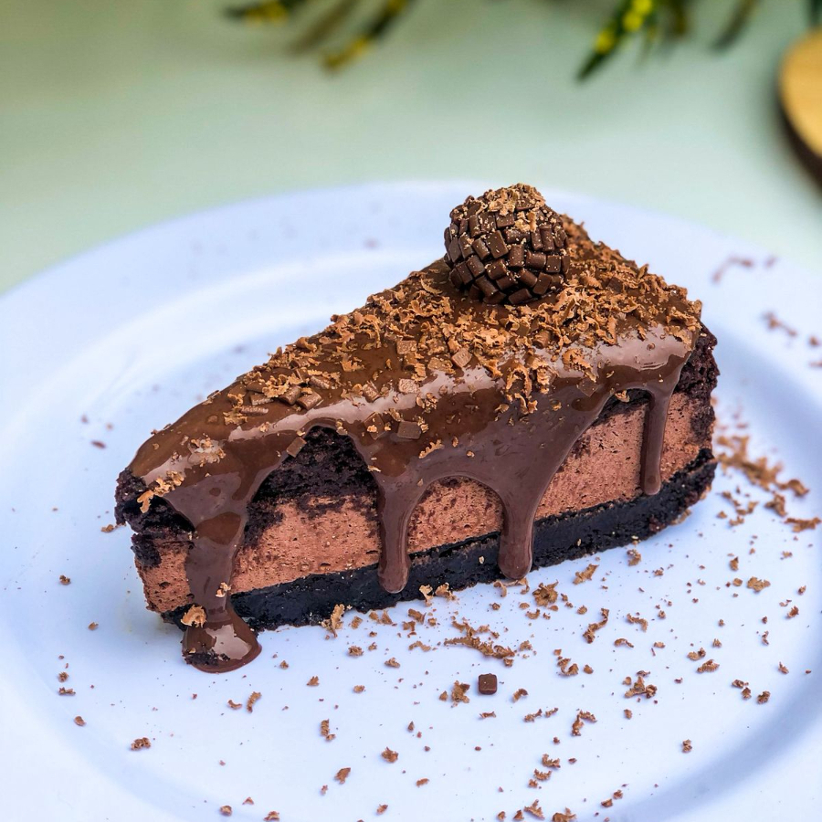 Feita com bolo em baixo e brownie em cima, mousse de chocolate no meio e brigadeiro gourmet em cima, finalizada com raspas de chocolate