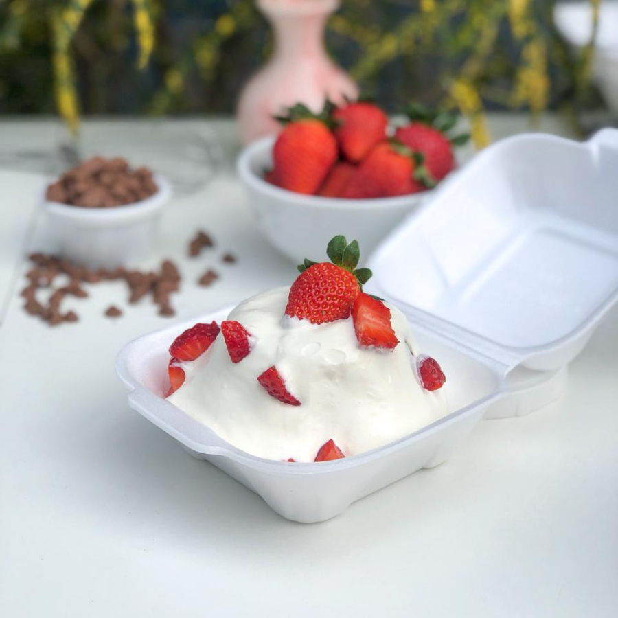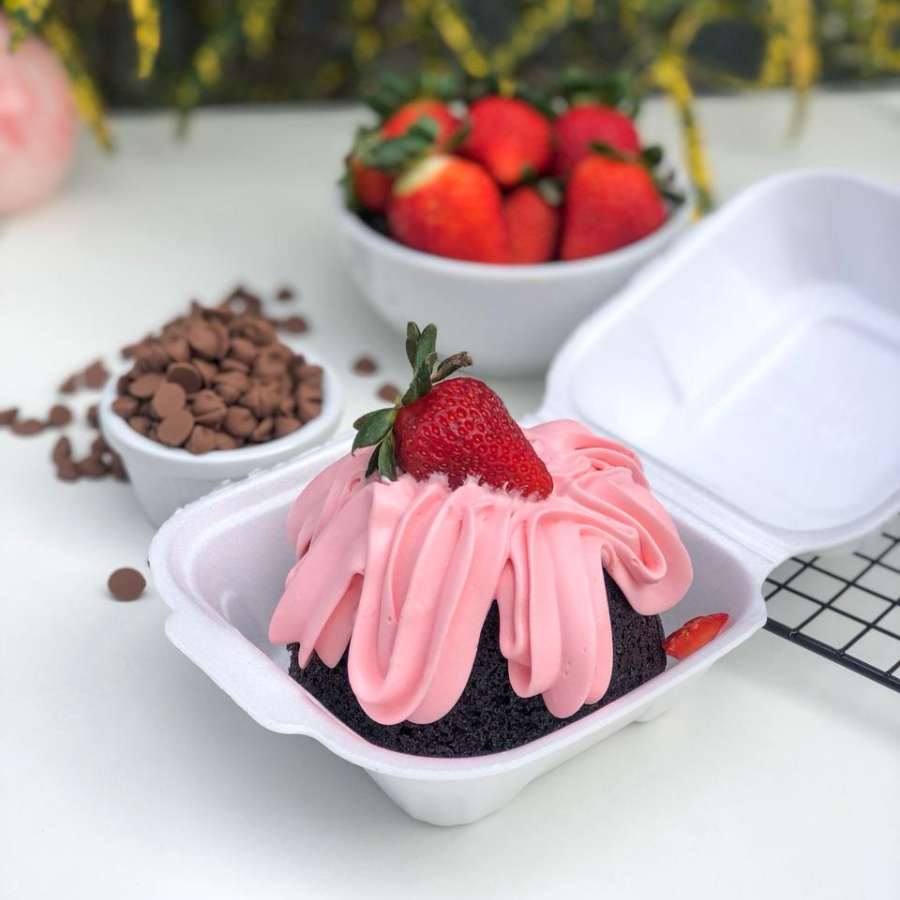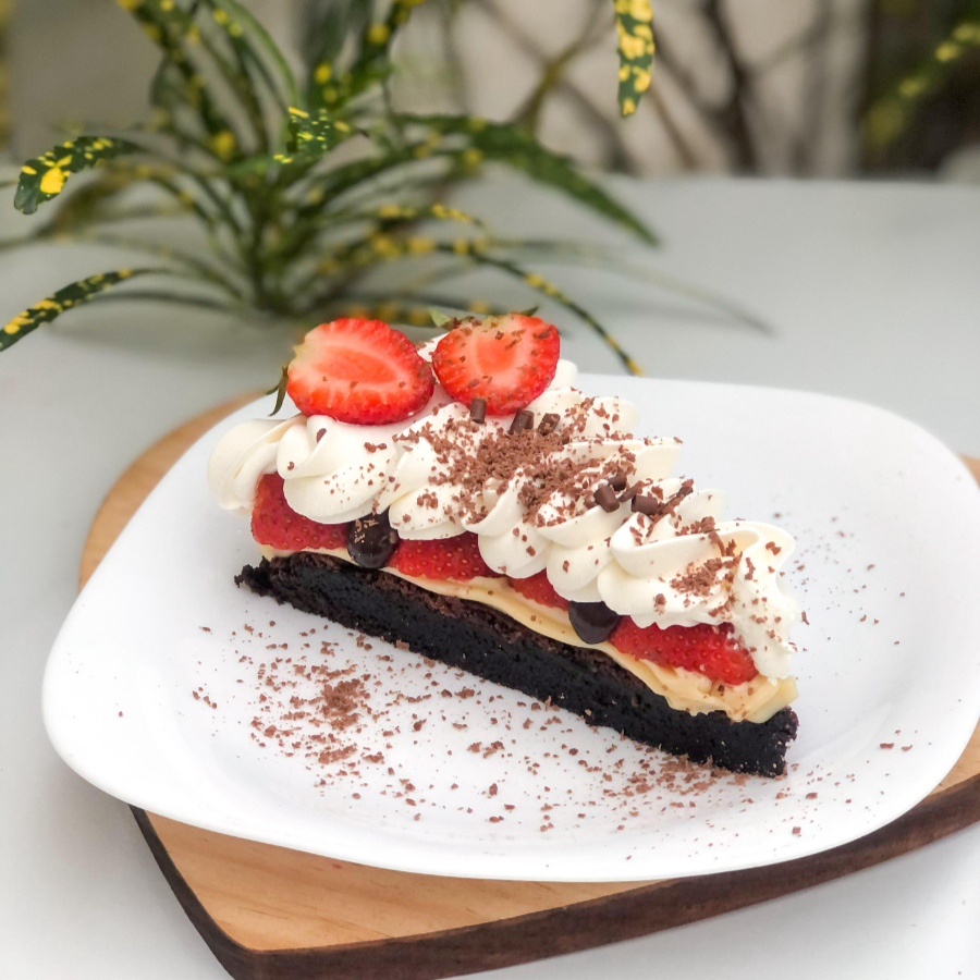 Brownie, brigadeiro branco cremoso, mousse de chocolate, chantininho e morango.