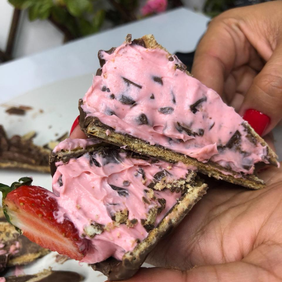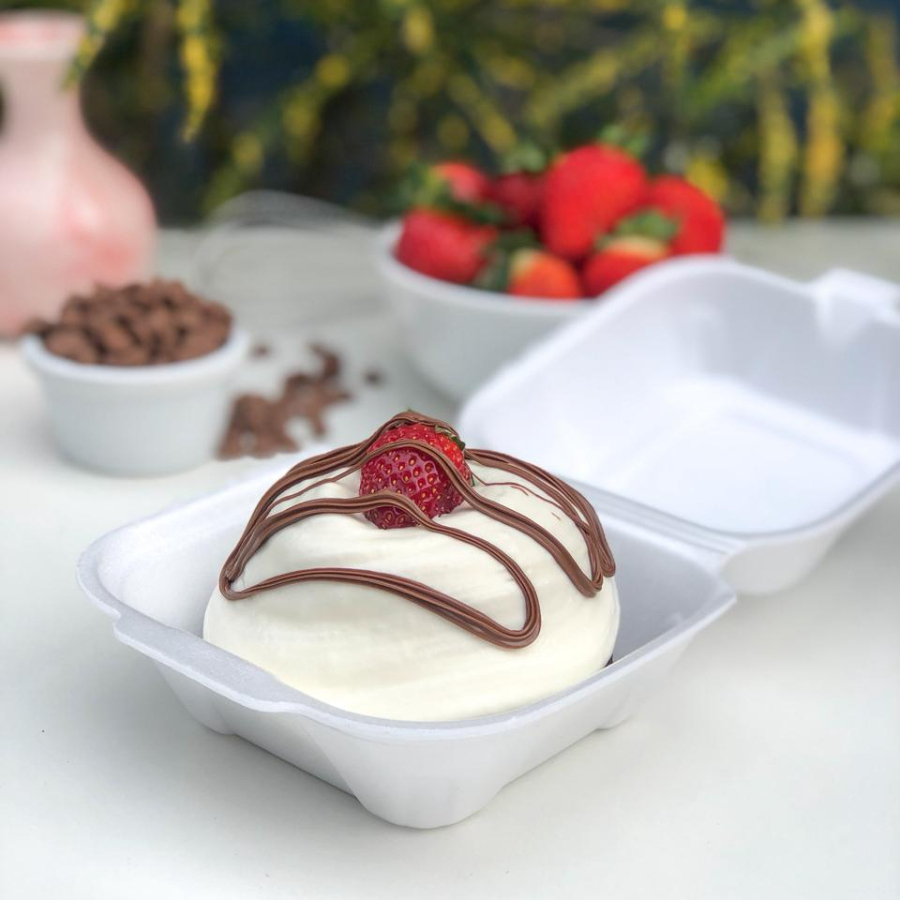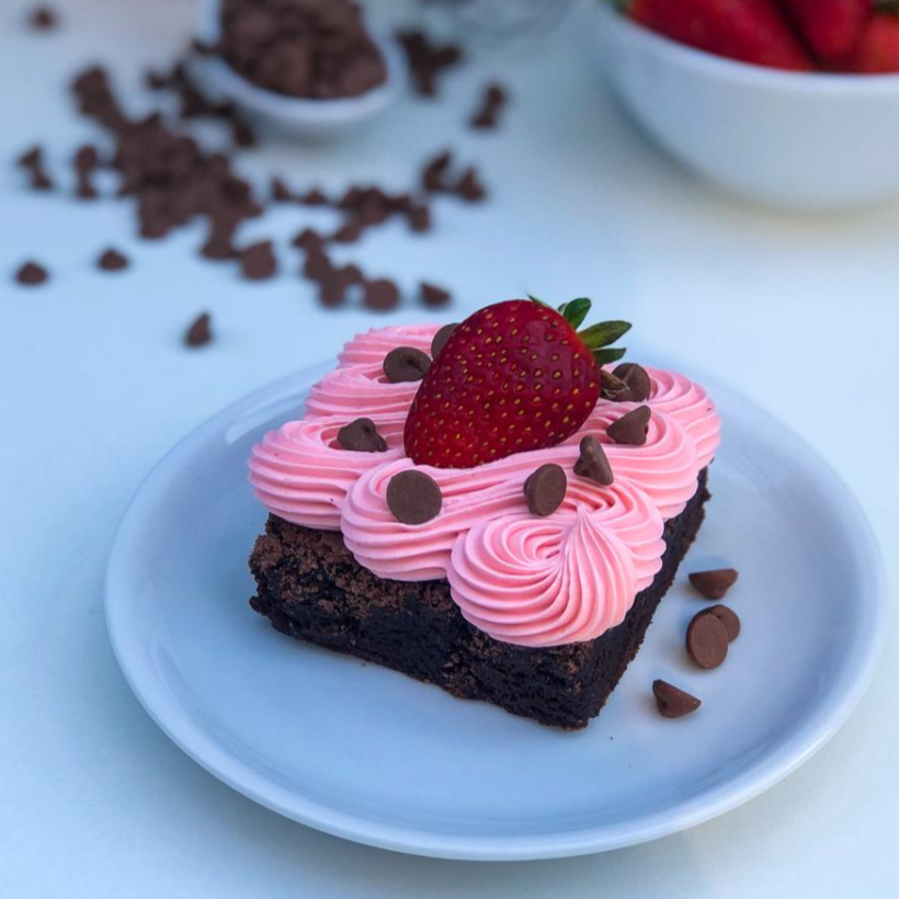 Base de brownie, brigadeiro branco, morangos, pingos de brigadeiro gourmet e chantininho.