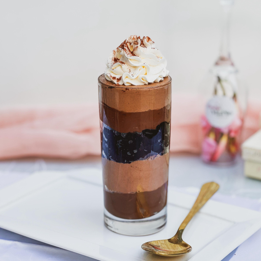 Brigadeiro gourmet cremoso, mousse de chocolate, brownie molhadinho e crocante, chantininho, finalizado com chuvinha de cacau.