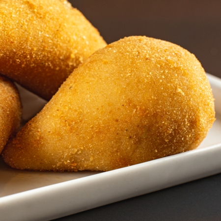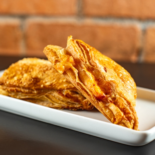 Doce em formato de triangulo com massa fininha de rocambole recheada com pavê de chocolate amanteigado.