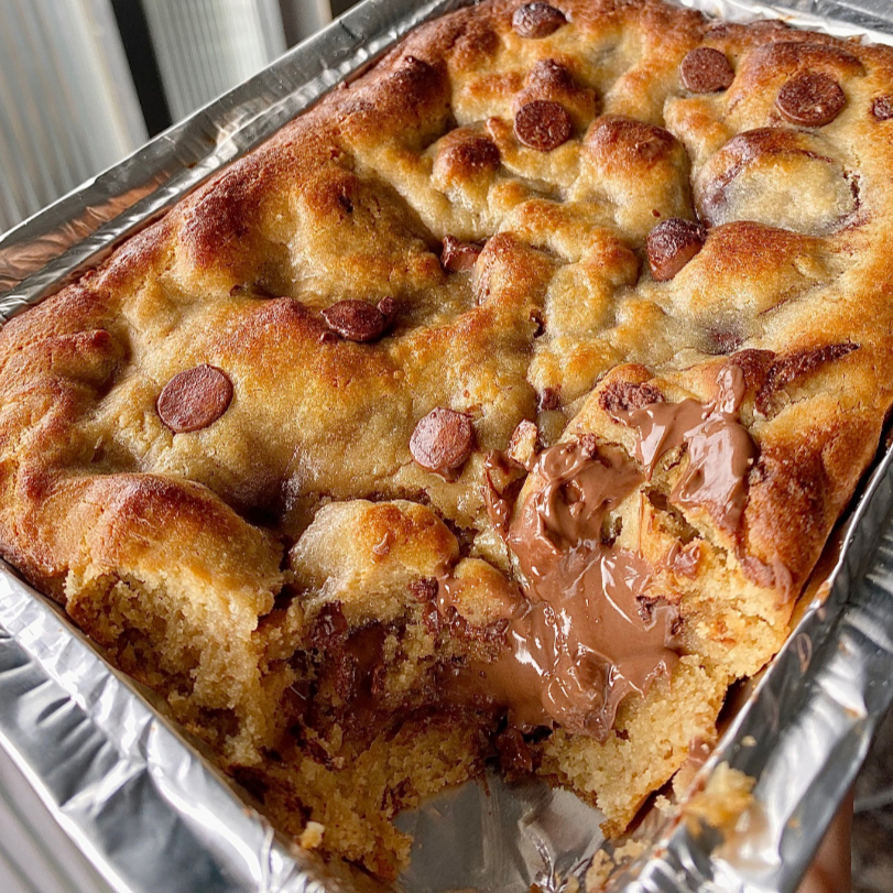Cookie recheado com gotas de chocolate nobre ao leite e moedas chocolate nobre ao leite por cima.