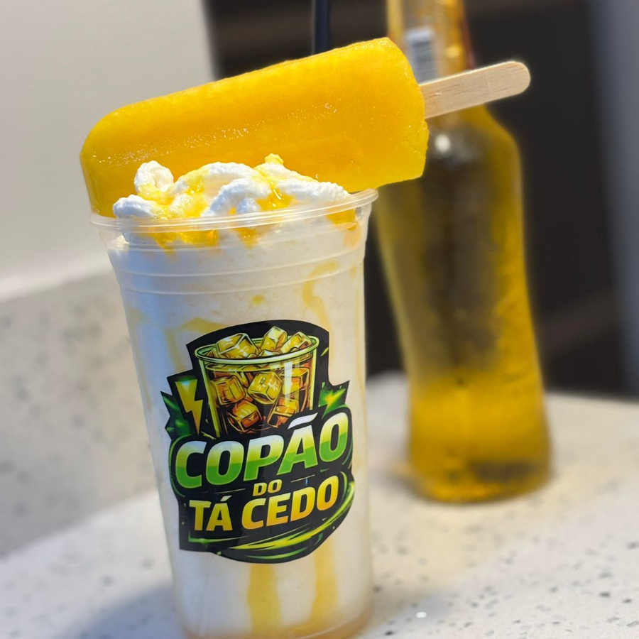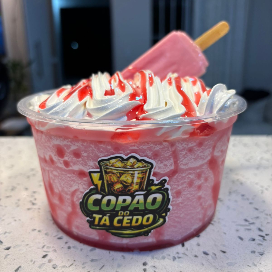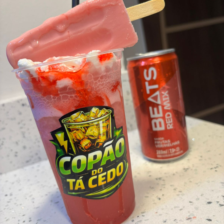 Skol Beats vermelha, leite condensado, gelo, um delicioso Merengue, calda de sorvete e um picolé.