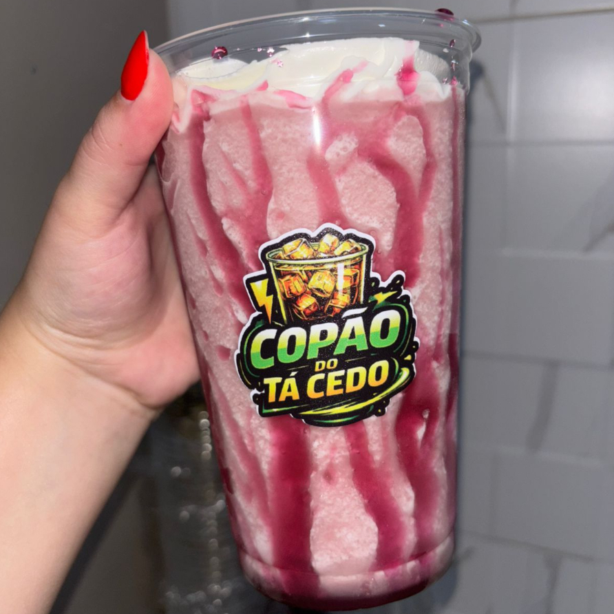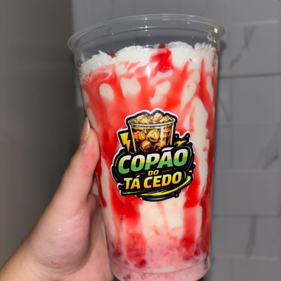 Uma bebida de Morangos Frescos, yakult, leite condensado, Finalizado com merengue e cobertura