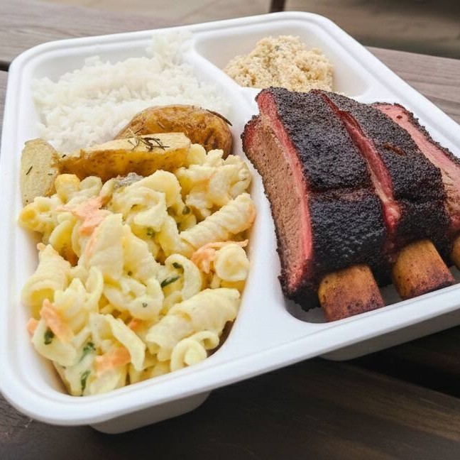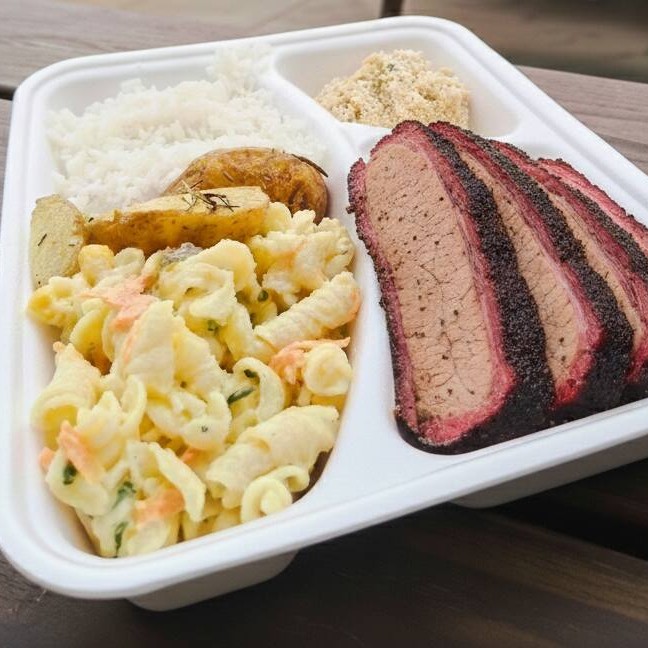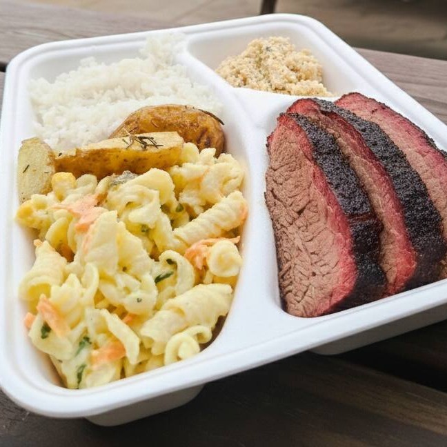 Arroz, Brisket. Farofa, Batata Rústica e Macarronese