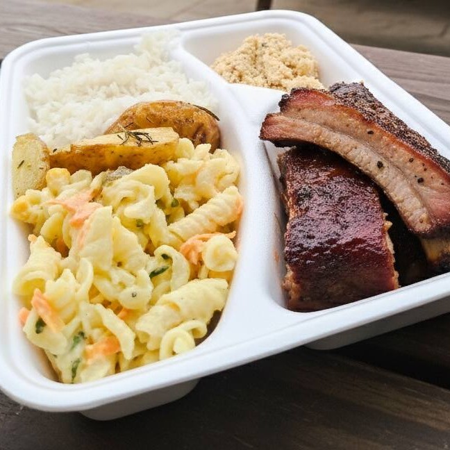 Arroz, Costelinha Suína, Farofa, Batata rústica e Macarronese