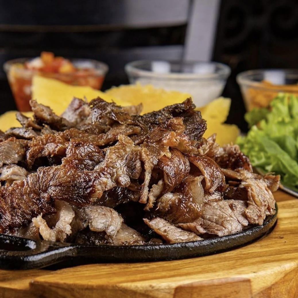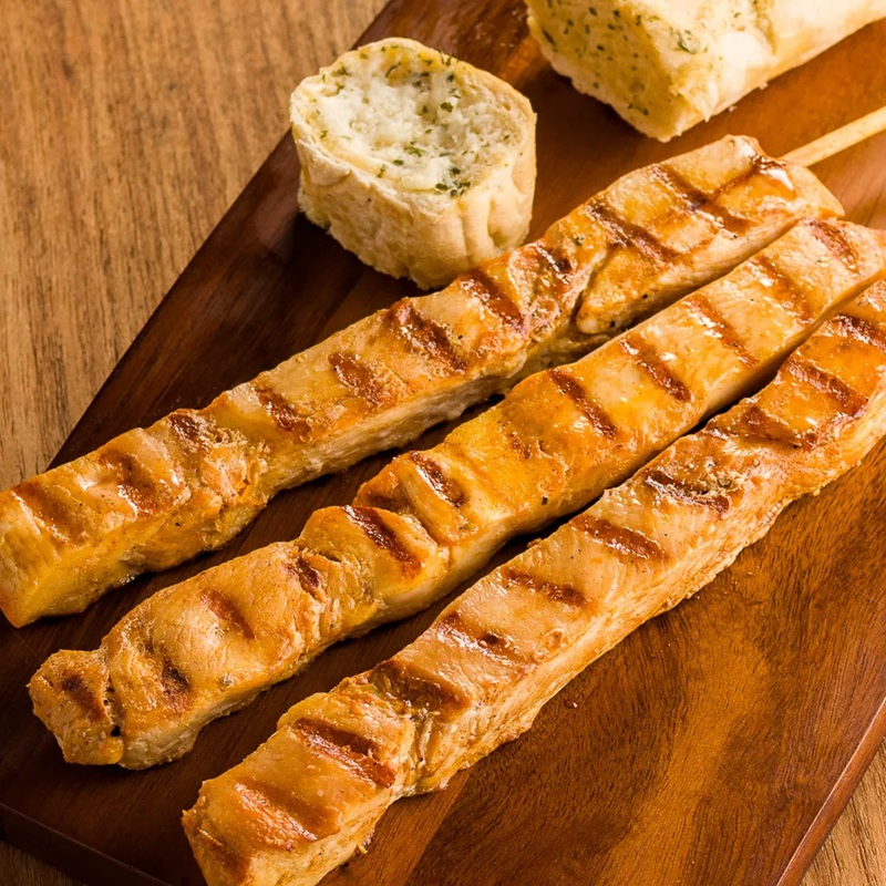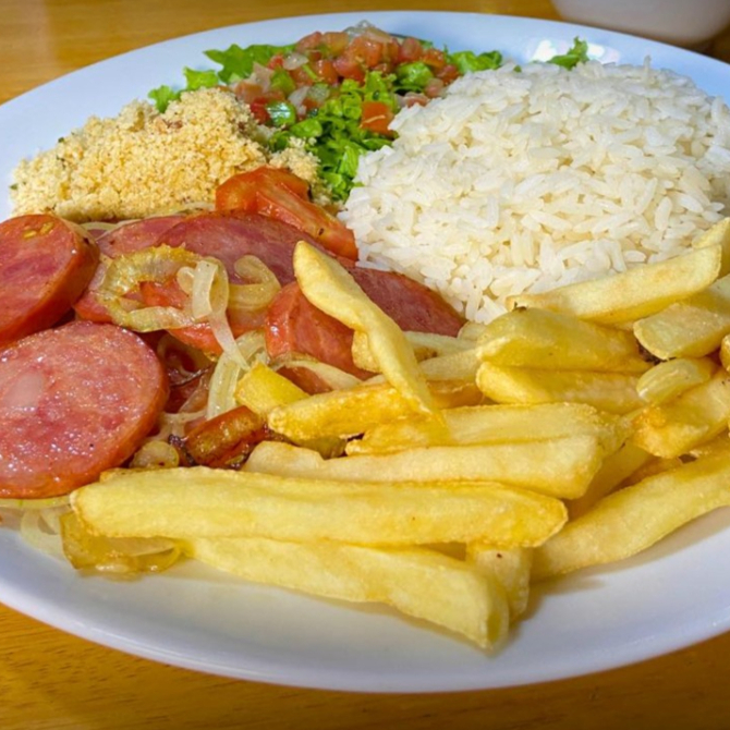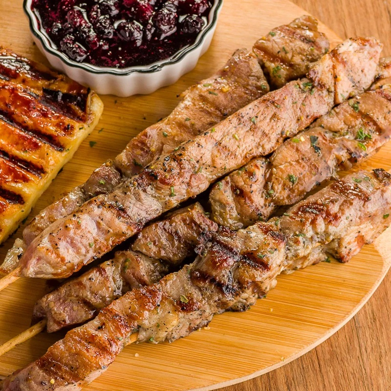 Inclui 3 espetos de carne, 2 espetos de frango, 2 espetos de linguiça, arroz, batata frita, vinagrete e farofa.
