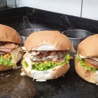 Pão, carne, presunto, queijo, bacon, ovo e salada