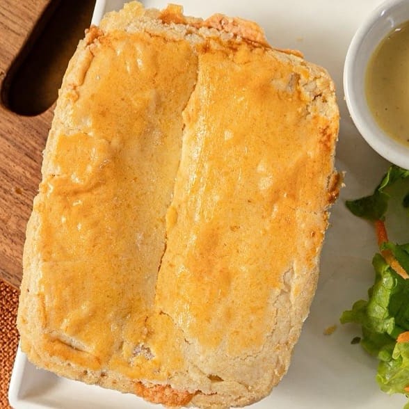 Massa leve e amanteigada, recheada com frango desfiado e temperado no ponto certo, cremoso e cheio de sabor caseiro. Produzido artesanalmente, com ingredientes frescos e selecionados, para você sentir o carinho em cada pedaço. Ideal para o seu almoço, jantar ou lanche especial.