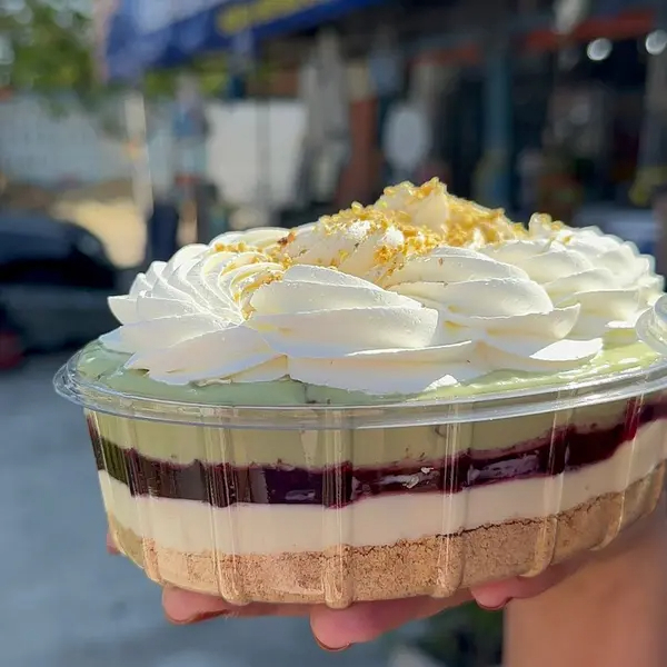 Massa branca molhadinha, recheada com mousse de limão, geleia de frutas vermelhas e Creme de Ninho, finalizada com um irresistível creme de pistache e farelo crocante de pistache.