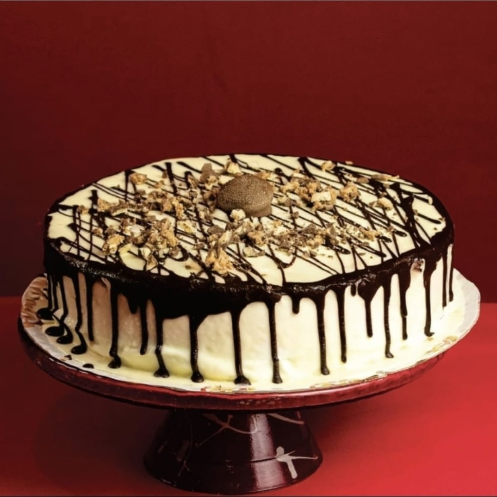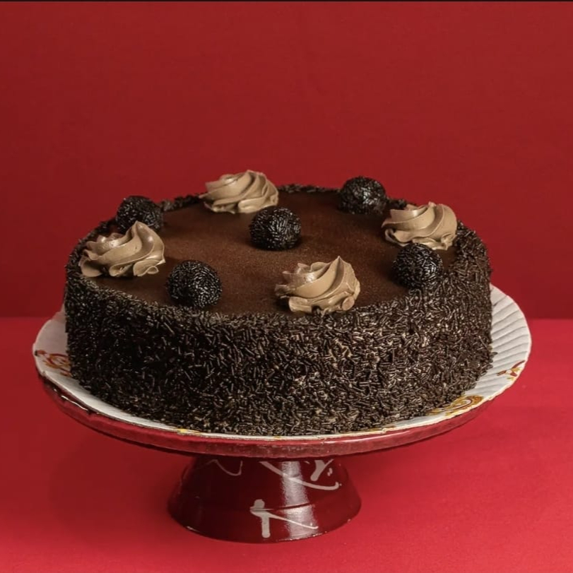 Massa de pão de ló de chocolate, umedecida com calda de chocolate. Recheada com brigadeiro preto e coberta com ganache cremosa e brigadeiro . Importante: As Tortas são entregues congeladas e precisam de aproximadamente 1h30 para descongelamento antes de serem servidas.