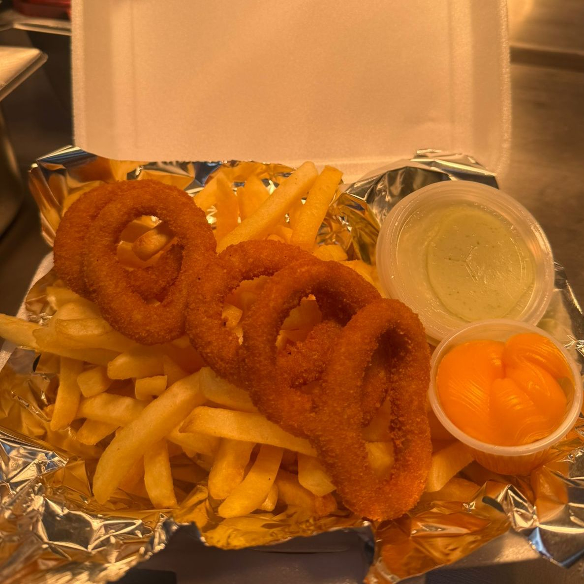 1kg de batata, anel de cebola, nugget, isca de frango e molhos