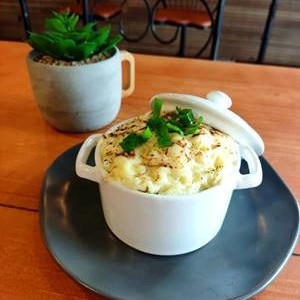 Batata, cheddar cremoso e farofa de bacon.