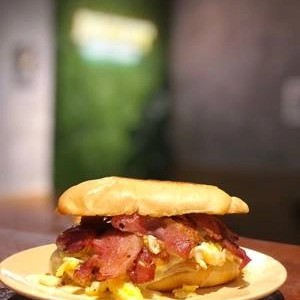 Pão de parmesão, linguiça defumada ,cheddar cremoso e farofa de bacon .