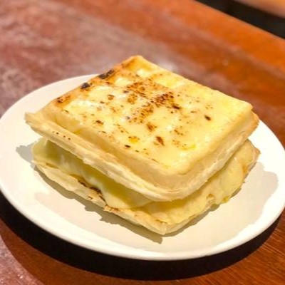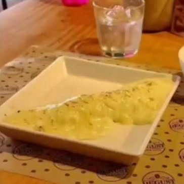 Pão de parmesão, linguiça defumada, cream chease, cebola crispy, mussarela gratinada