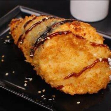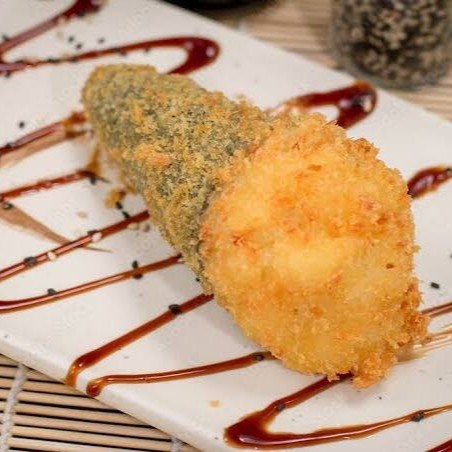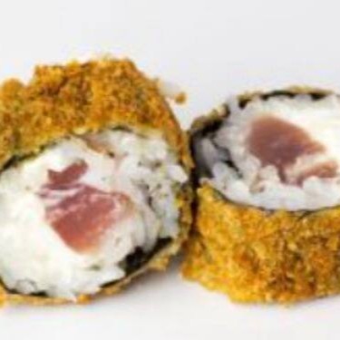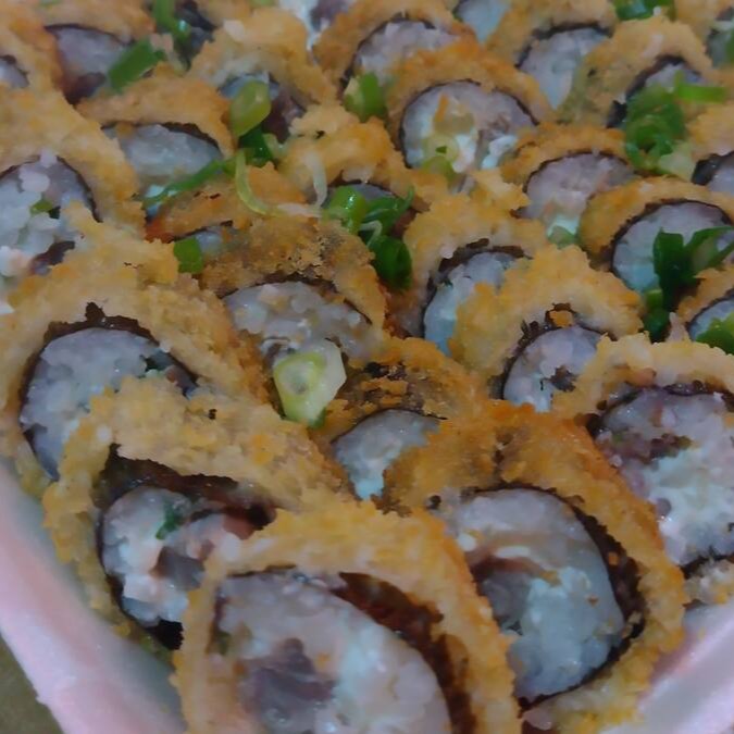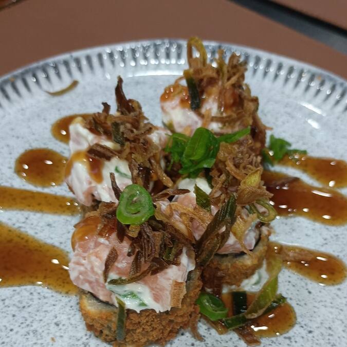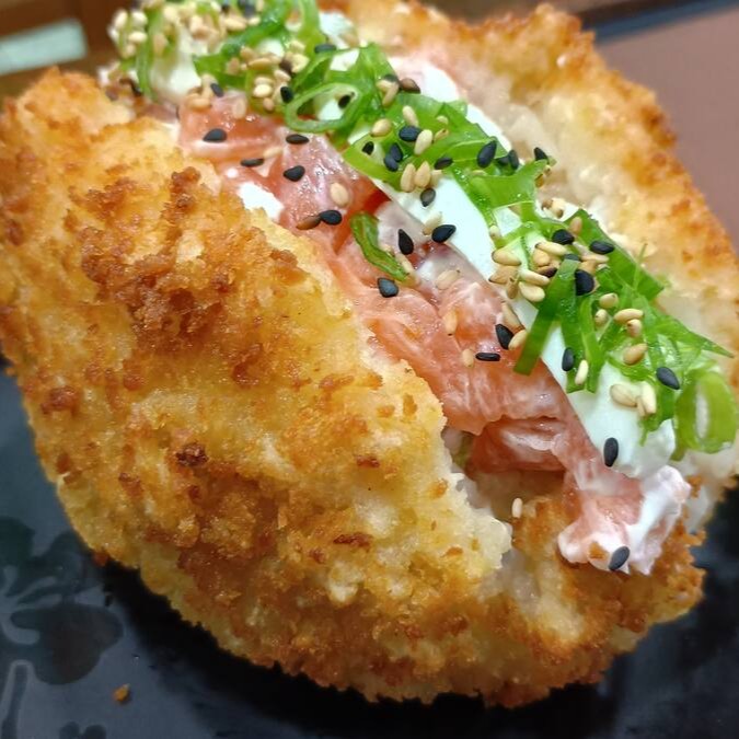 Arroz japonês empanado, com recheio de salmão, creme cheese e Cebolinha